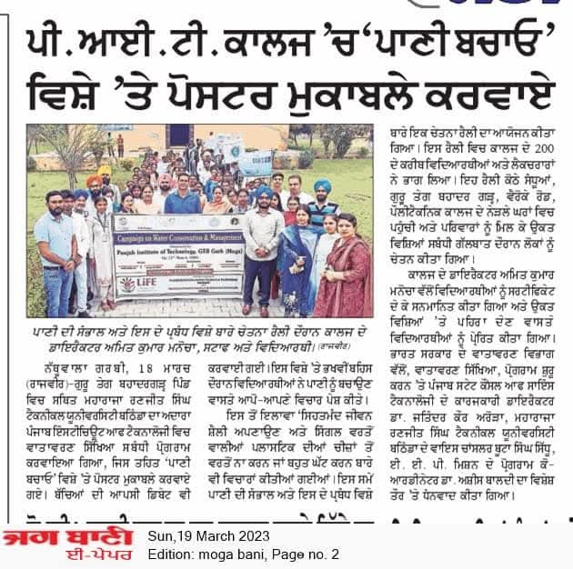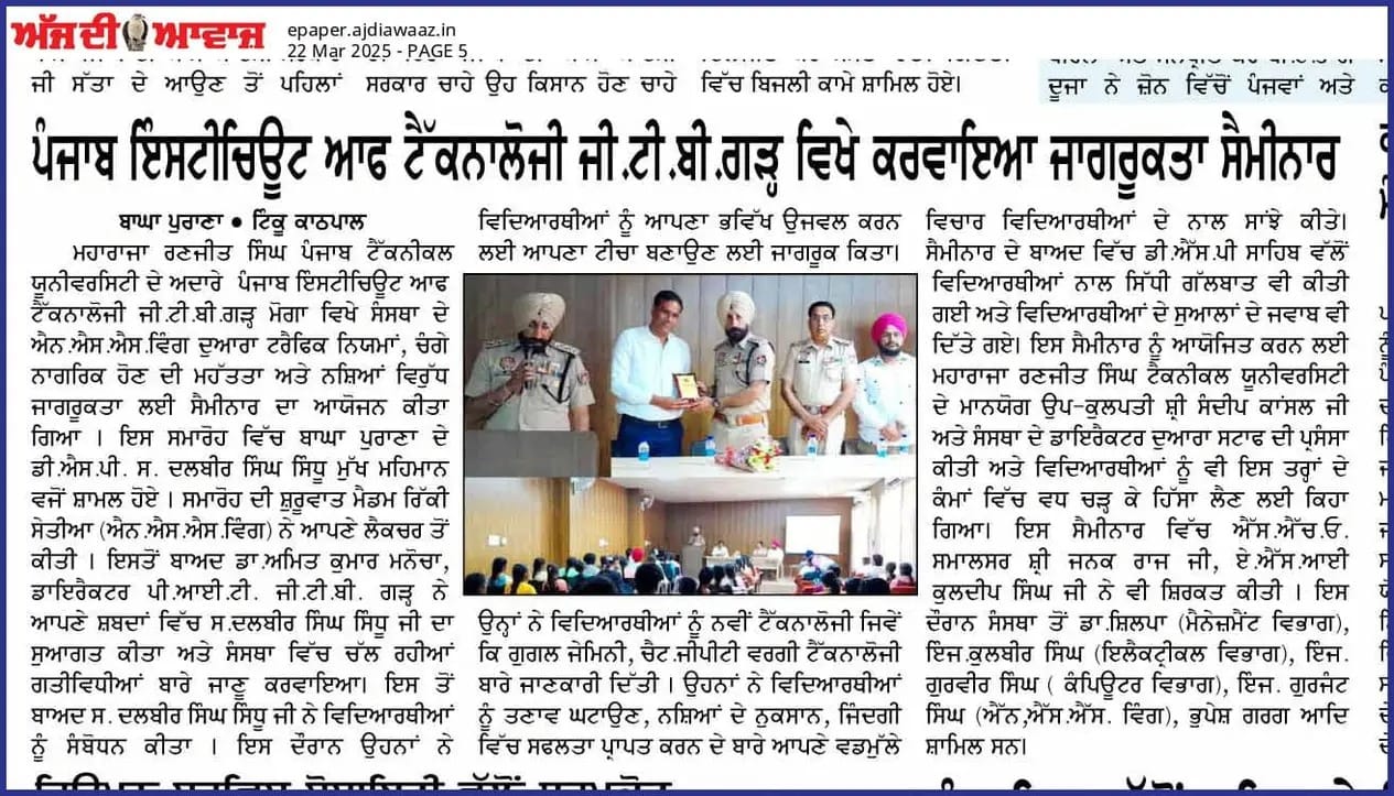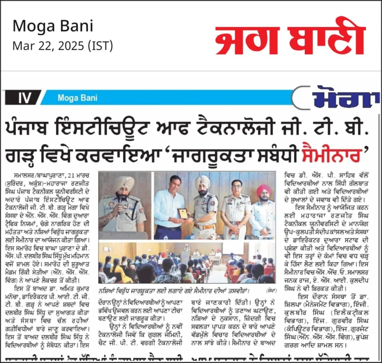 | 21-03-2025 | Awareness seminar organized at Punjab Institute of Technology, GTB Garh, Moga. | Jagbani Aj DI Aawaj |