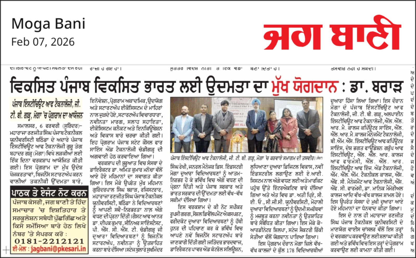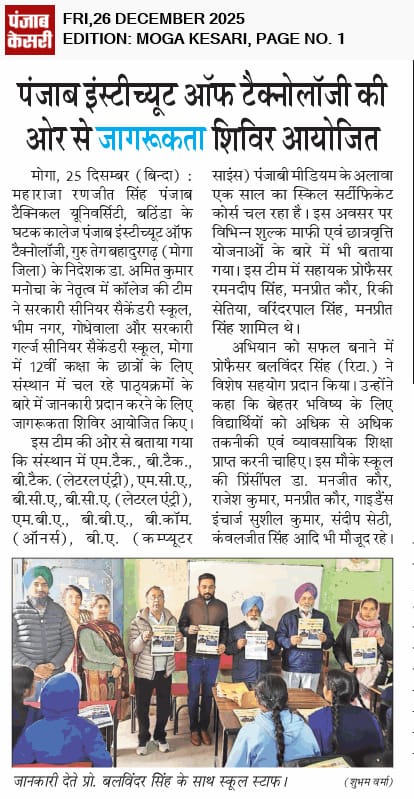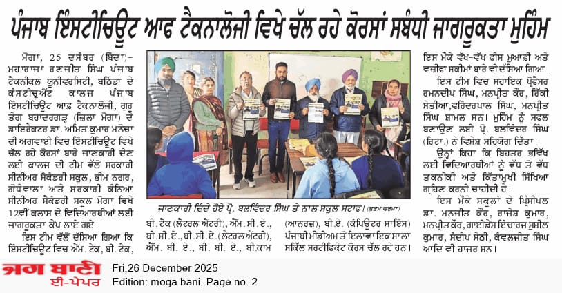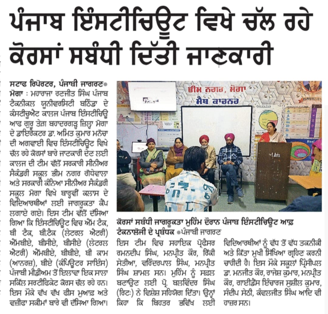 | 26-12-2025 | Awareness campaign regarding courses being conducted by Punjab Institute of Technology,GTB Garh(Moga). | Jagbani, Punjab Jagran, Punjab Kesri |