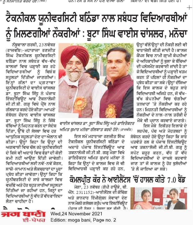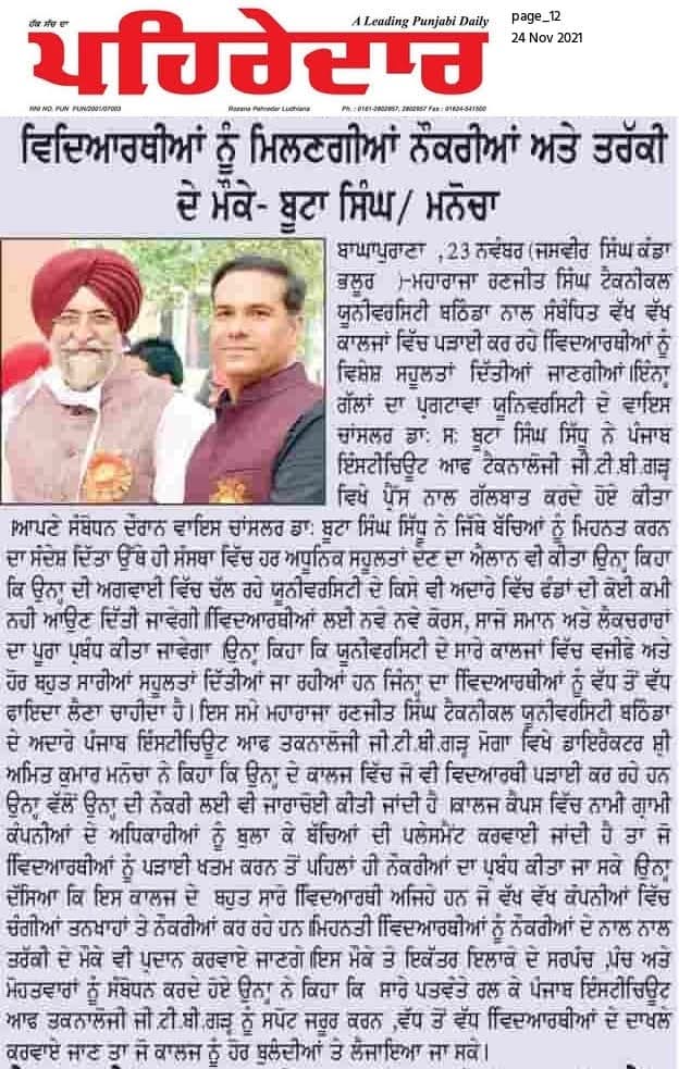 | 24-11-2021 | VC S.Boota Singh visited PIT, GTB, Garh(Moga). | Jag Bani Pehredar |