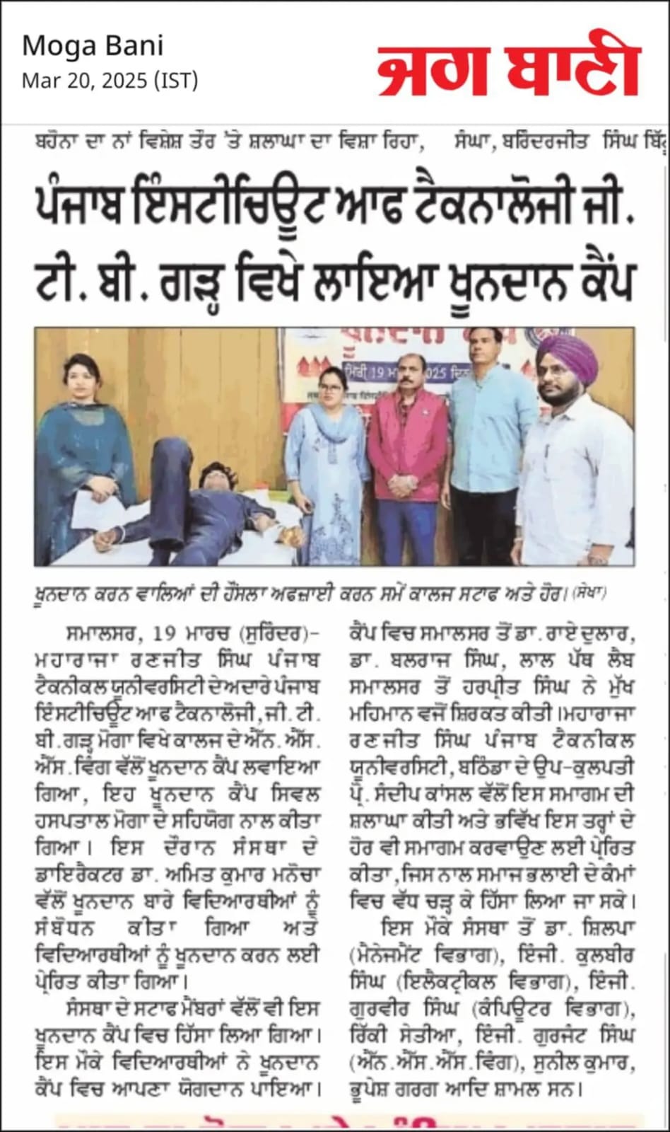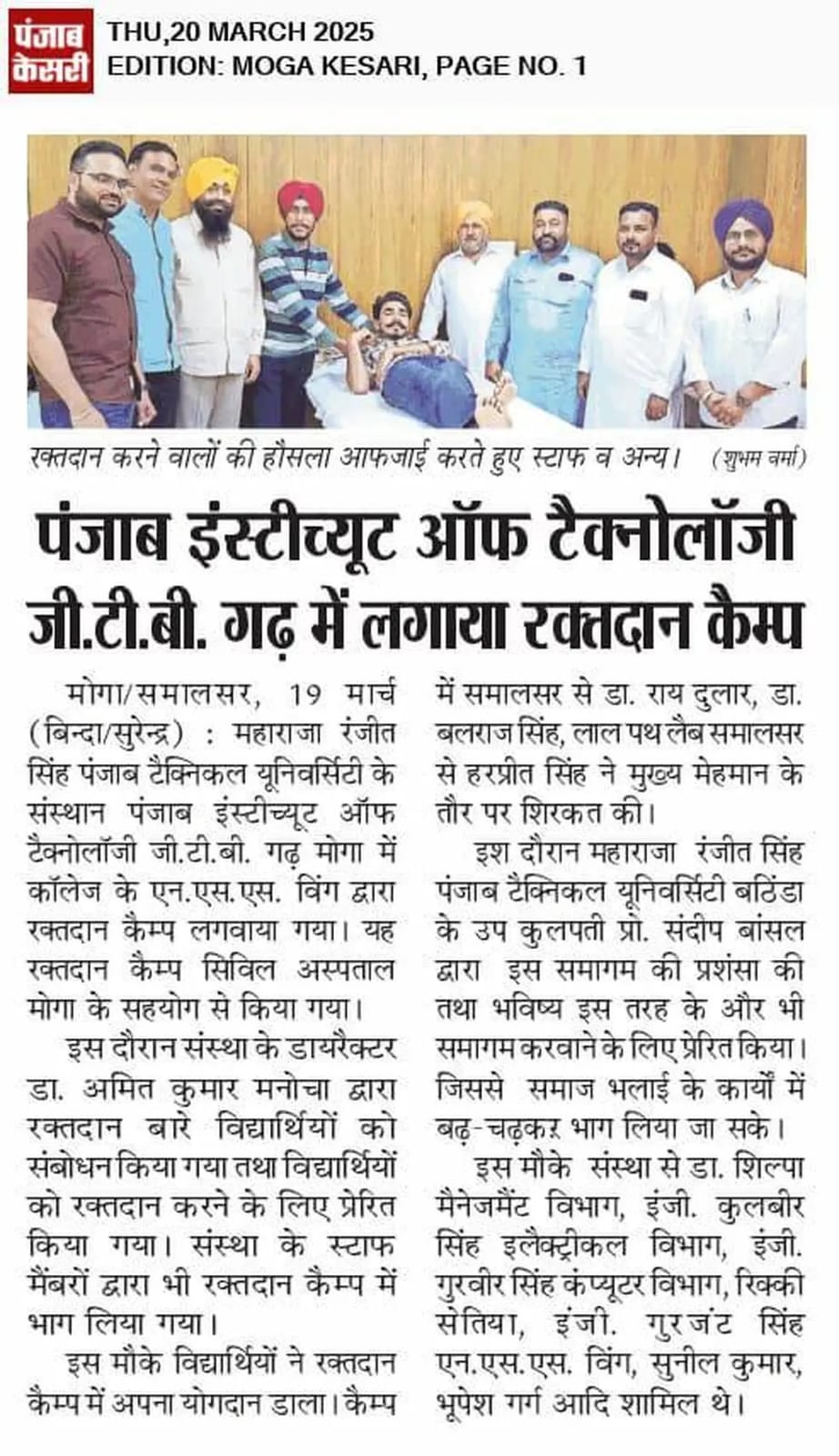 | 19-03-2025 | Boold Donation Camp at Punjab Institute of Technology, GTB Garh, Moga. | Jagbani Punjab Kesri |